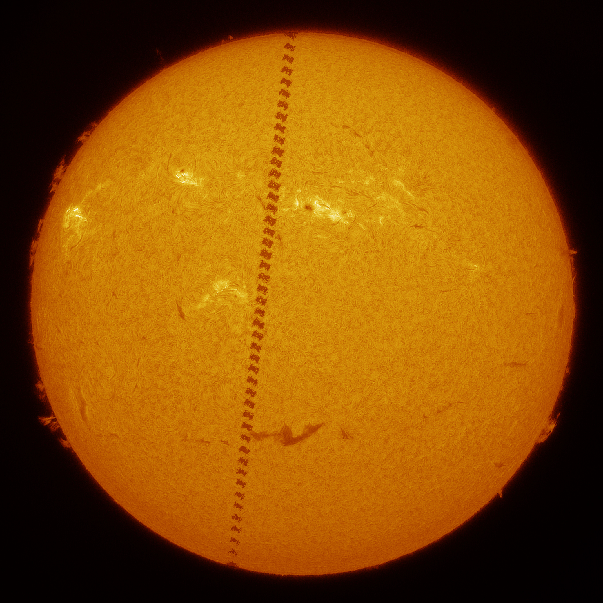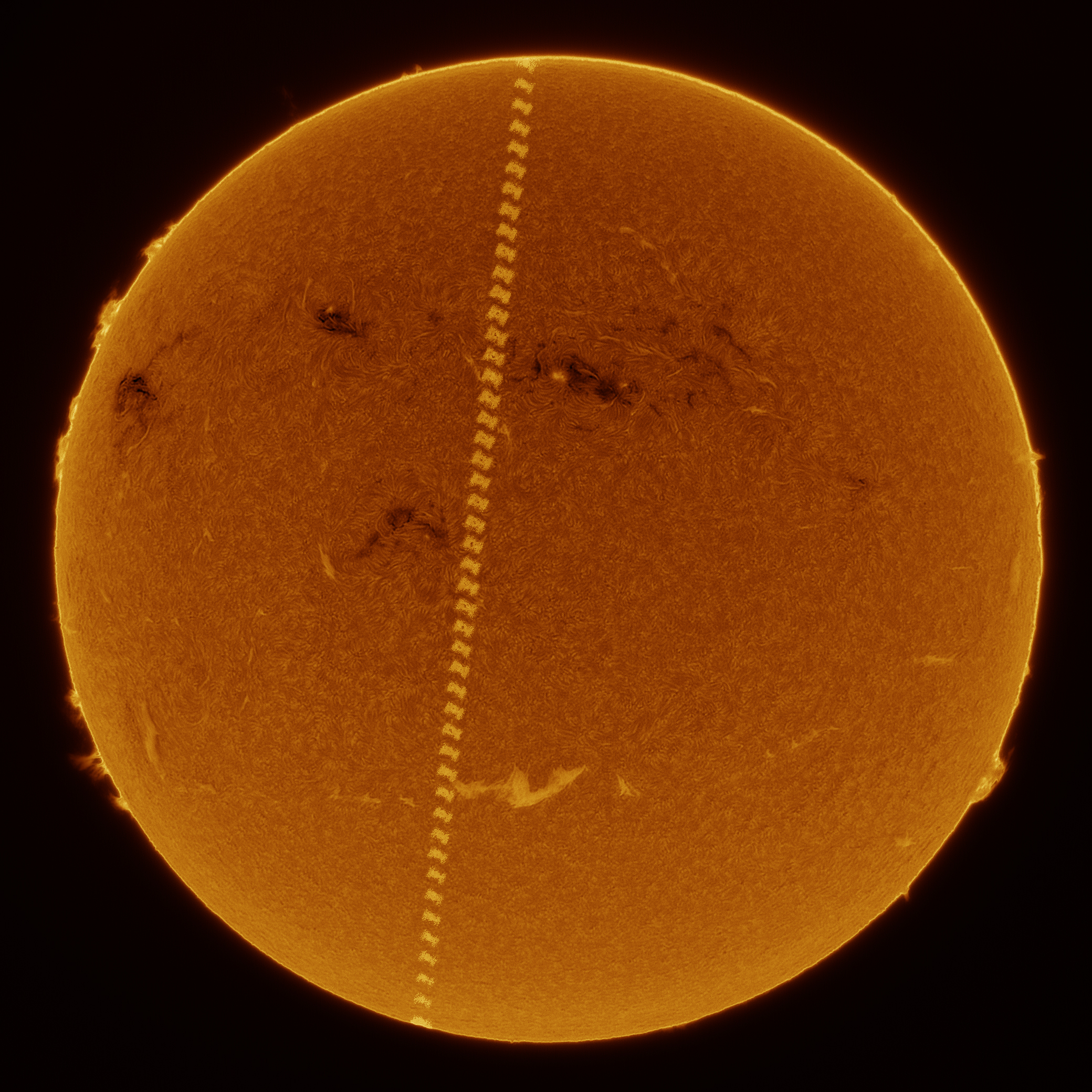 这两天琢磨了一下,硬着头皮做了带日面背景的空间站轨迹图,放大看就露馅了。。。请各位大佬们指正错误,我也总结经验,下次再接再厉。(下图黑白的是47帧的轨迹堆栈原图)