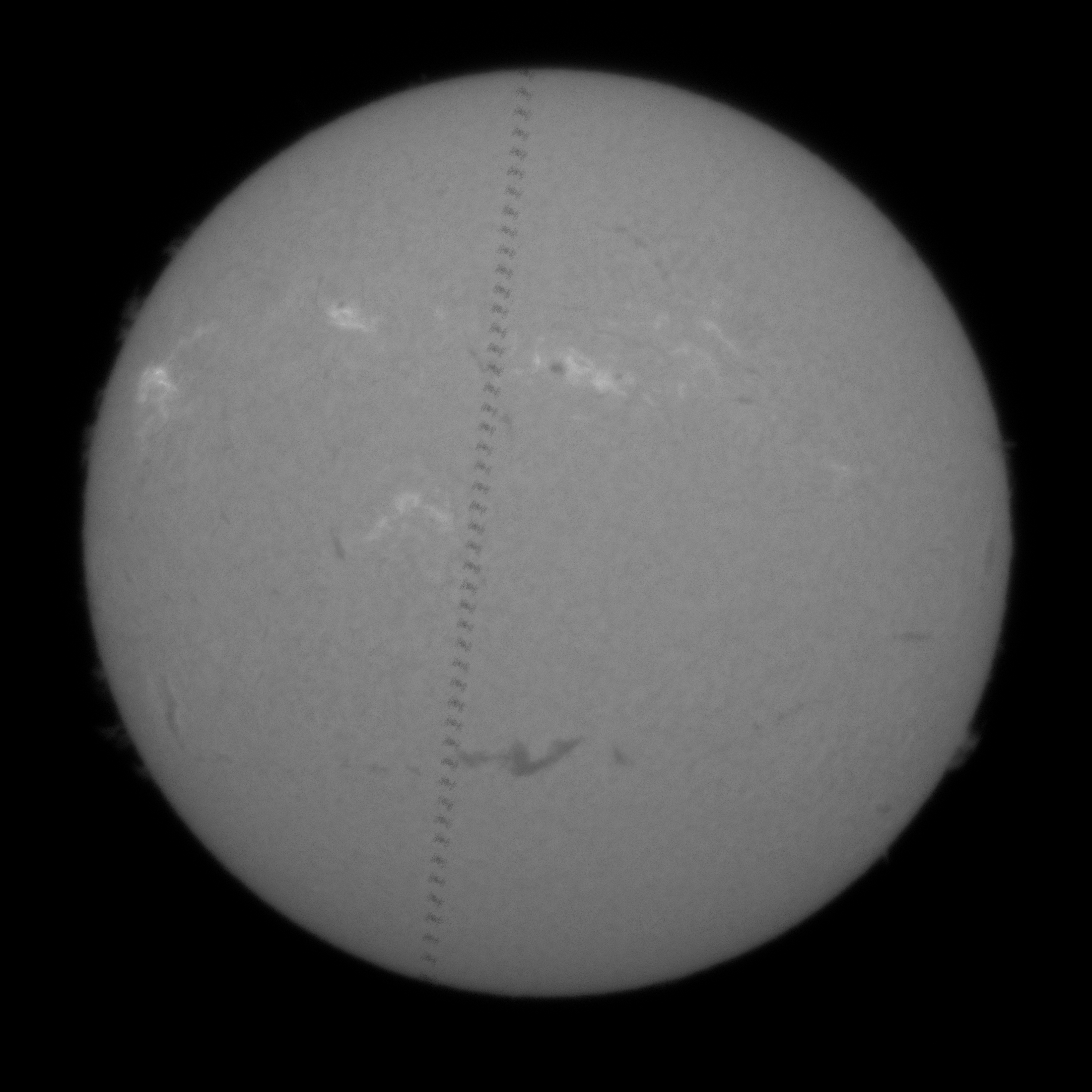 新手刚购买的日珥镜,还用不太熟练的情况下拍的ISS凌日。后面问了一些大佬,可能拍的时候谐调没调好,外加焦没对准,选的水泥路面视宁也不好,导致空间站糊了。